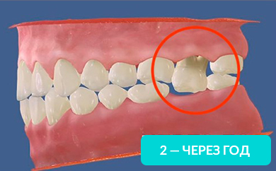 На рисунке справа видно, какие щели между зубов образуются уже через год, после удаления.